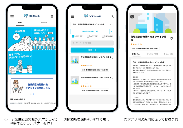 この度、「茨城県臨時発熱外来」におけるオンライン診療体制の構築に際し、「SOKUYAKU」が活用されることになりました。これにより、希望者は「SOKUYAKU」アプリを通じて、医師によるオンライン診療をはじめ、服薬指導の受診、処方薬配送サービスも利用可能になります。