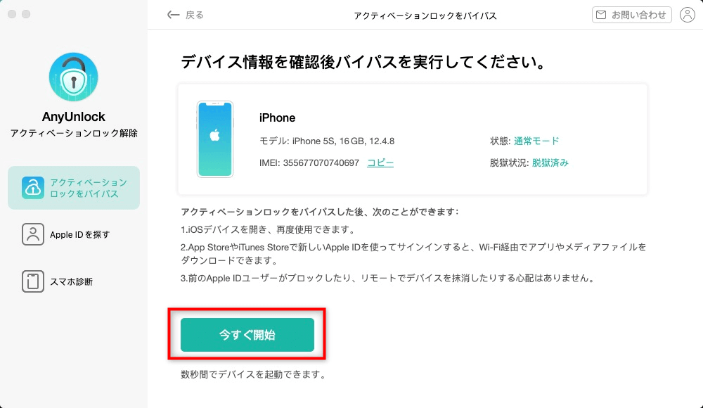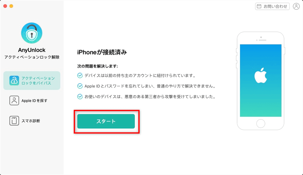 ステップ2.「アクティベーションロックをバイパス」>「スタート」をクリックします。