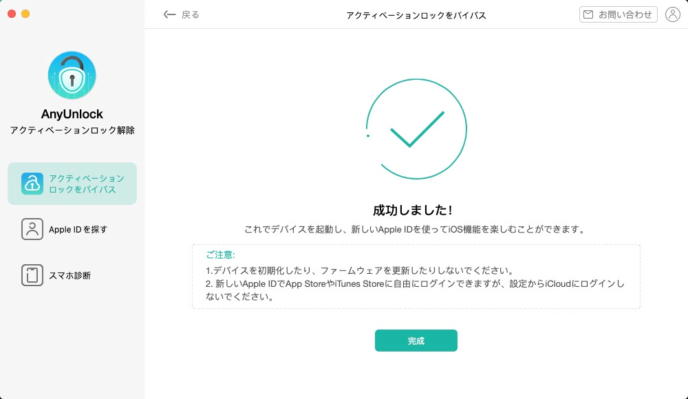 ステップ5.バイパス処理が完了すると、以下のようなインターフェイスが表示されます。最後は「完成」をクリックします。