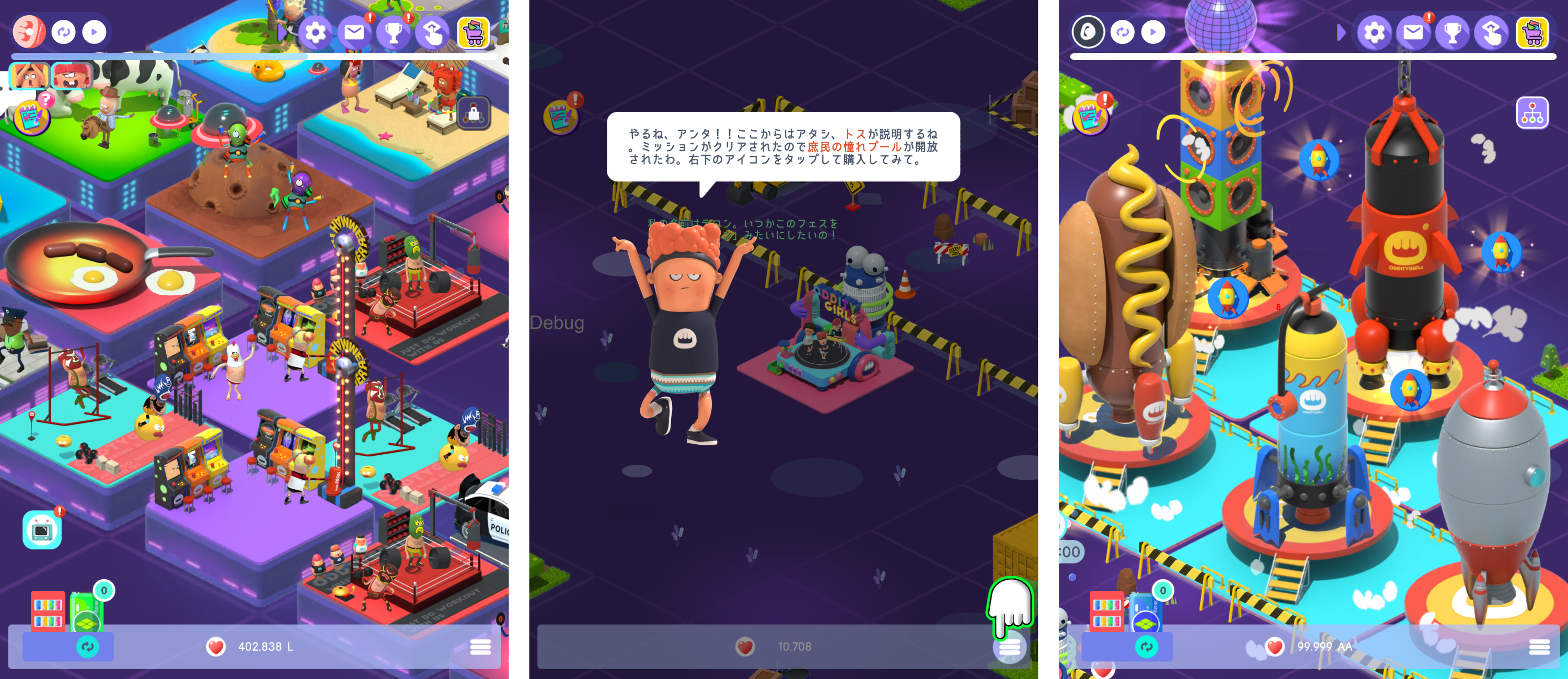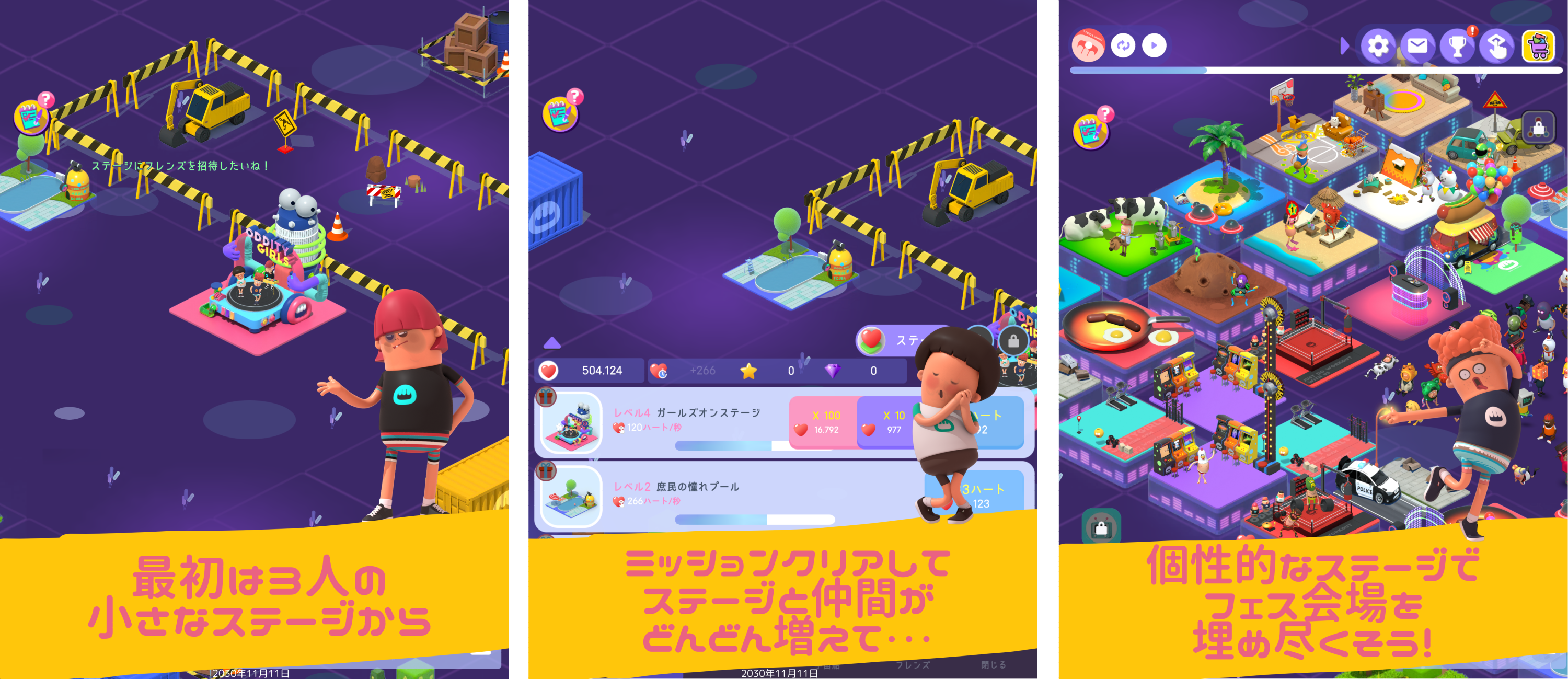 『オディッティフェス』はテス・トス・テロンの女性三人組ユニット「オディッティガールズ」が始めたダンスステージを中心に、個性的なステージと仲間でフェス会場を埋め尽くしていく、フェス会場運営型タップ&放置シミュレーションゲームです。