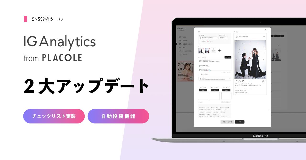 SNSマーケティング事業を展開しているプラコレは、SNS運用でお困りのブライダル企業を今まで以上にサポートするために、「IG Analytics」をリリース。そして、より多くのInstagramアカウントをかわいくおしゃれに、SNSを活用して 卒花から集客できる時代を目指す為に『ハッシュタグ自動抽出機能』やビジネスでのInstagram利用が増加した現在、さらなる業務効率化のため、無期限利用できる『ファイルデータ保存機能』や新機能『TikTok分析機能』をリリース。マーケティングの場としての注目度も高いTikTok。どの配信動画が反応が良いかなどの傾向が掴めるので、アカウントの成長に繋がりやすい分析機能となっております。