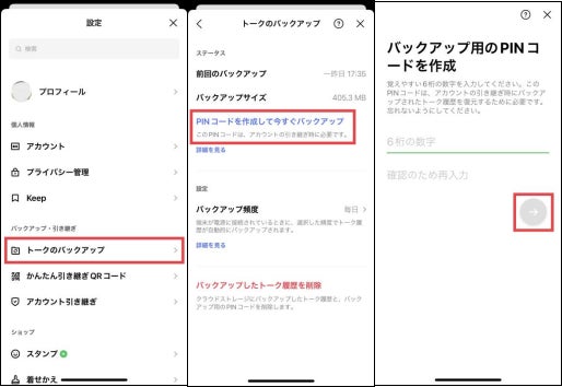 ●LINEの設定アイコンから、「トークのバックアップ」>「PINコードを作成して今すぐバックアップ」の順にタップして、PINコードを設定すると、その時点のバックアップをすぐに作成できます。