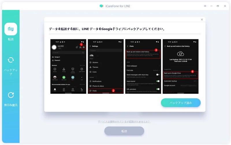 LINEデータの転送専門ソフトであるiCareFone for LINEを利用することで、異なるOS間でも全てのトーク履歴を引き継ぐことが可能です。誰でも簡単に利用できるシンプルな操作性が特長で、ステップごとに表示される手順に従って操作するだけで、引き継ぎ作業を完了させることが可能です。下記ではAndroidからiPhoneへの引き継ぎ手順を例にとってご説明します。