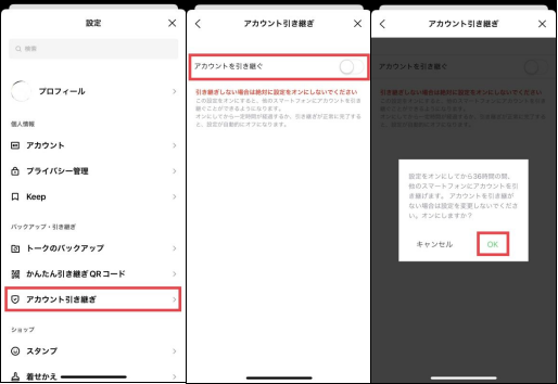 準備6、LINEのアカウント引き継ぎ設定をオンにする
