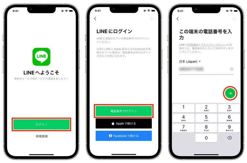 Step1: クイックスタートでiPhoneのデータ移行作業を行い、新しいiPhoneの初期設定が完了したら、新しいiPhoneでLINEアプリを開いて「ログイン」>「電話番号でログイン」の順にタップします。