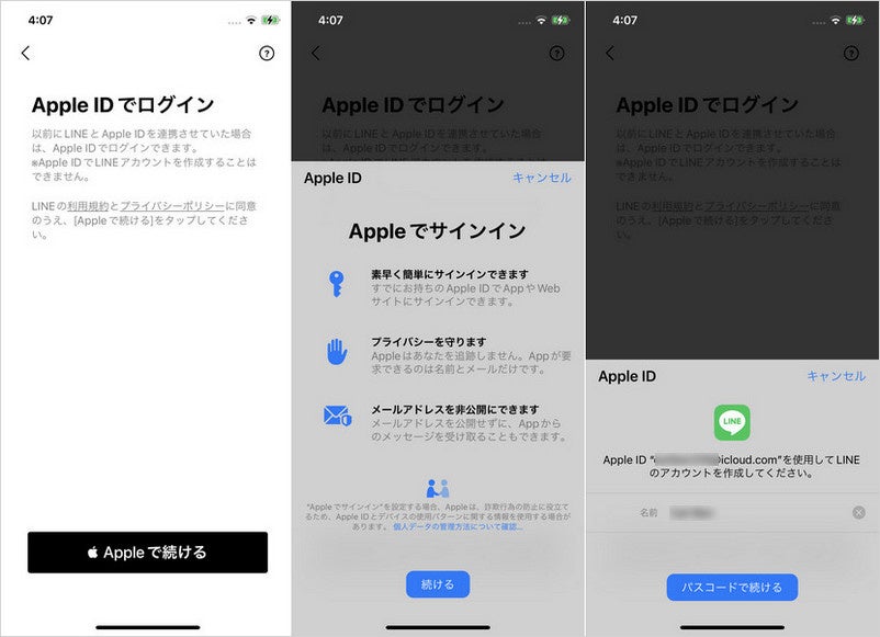 Step1: 新しいiPhoneでLINEアプリを起動して、「ログイン」>「Appleで続ける」>再度「Appleで続ける」の順にタップします。