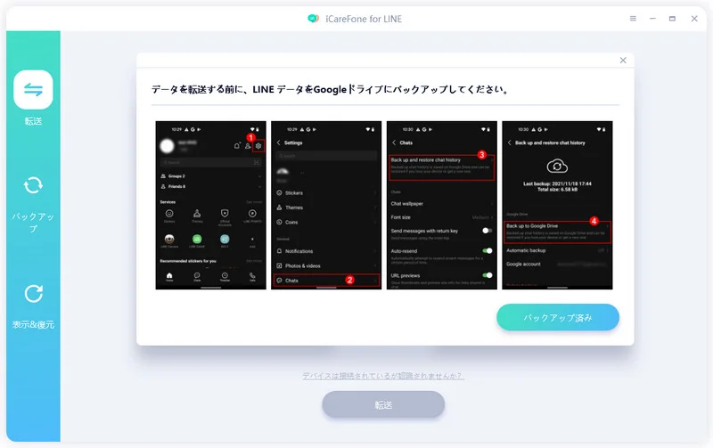 Step2: 画面の指示に従って、移行元のAndroidでLINEデータのバックアップを作成します。