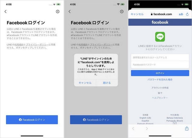 Step1: 新しい端末でLINEアプリを起動して、「ログイン」>「Facebookで続ける」>「Facebookでログイン」の順にタップします。