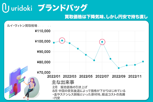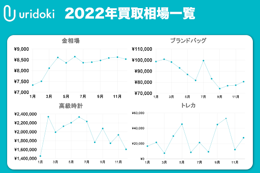 そこで、C2Bの買取プラットフォーム「ウリドキ」(https://uridoki.net/)を運営するウリドキ株式会社(所在地:東京都千代田区、代表取締役:木暮 康雄)では、自社の買取情報を元に、2022年の商品ごとに推移および買取額が上昇・下降した理由を考察。そこから2023年は買取価格がどう変わっていくのかを予想しました。