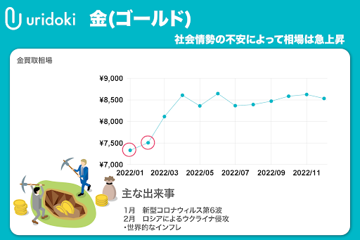 ロシアによるウクライナ侵攻によって安全資産である金の相場が急上昇。また、物資不足やコロナ禍のなかで蓄積されていた一般消費者の資金が流入して、インフレが加速したことも高騰の要因のひとつです。