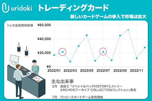 また、同年7月からは「ONE PIECEカードゲーム」の販売も開始。リリース初期から買取で高値がつき、人気を集めていることも夏以降の買取価格上昇の一因だと考えられます。