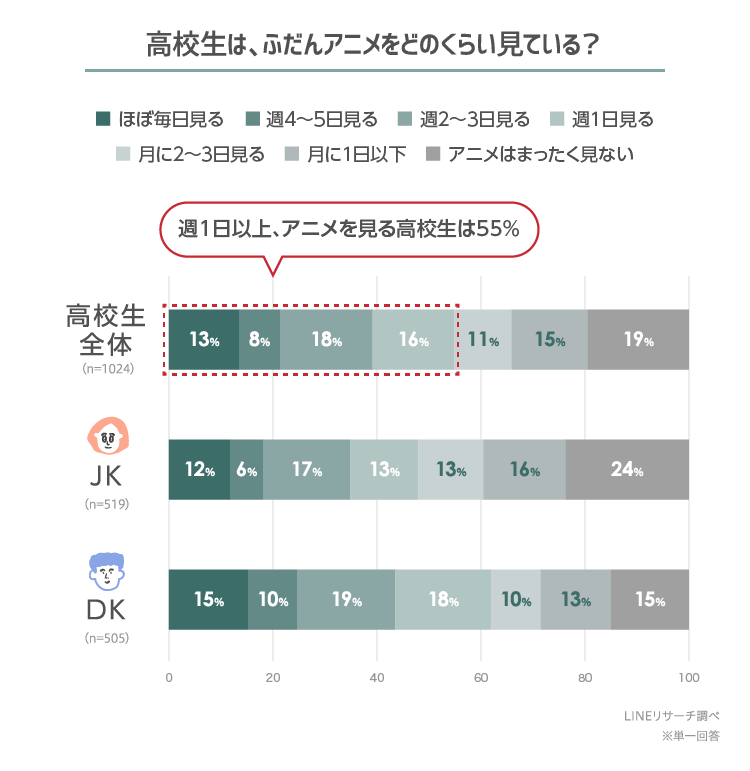 このたびLINEリサーチでは、日本全国の高校生を対象に、アニメを見る頻度やハマっているアニメなどについて調査しましたので、その結果をお知らせいたします。