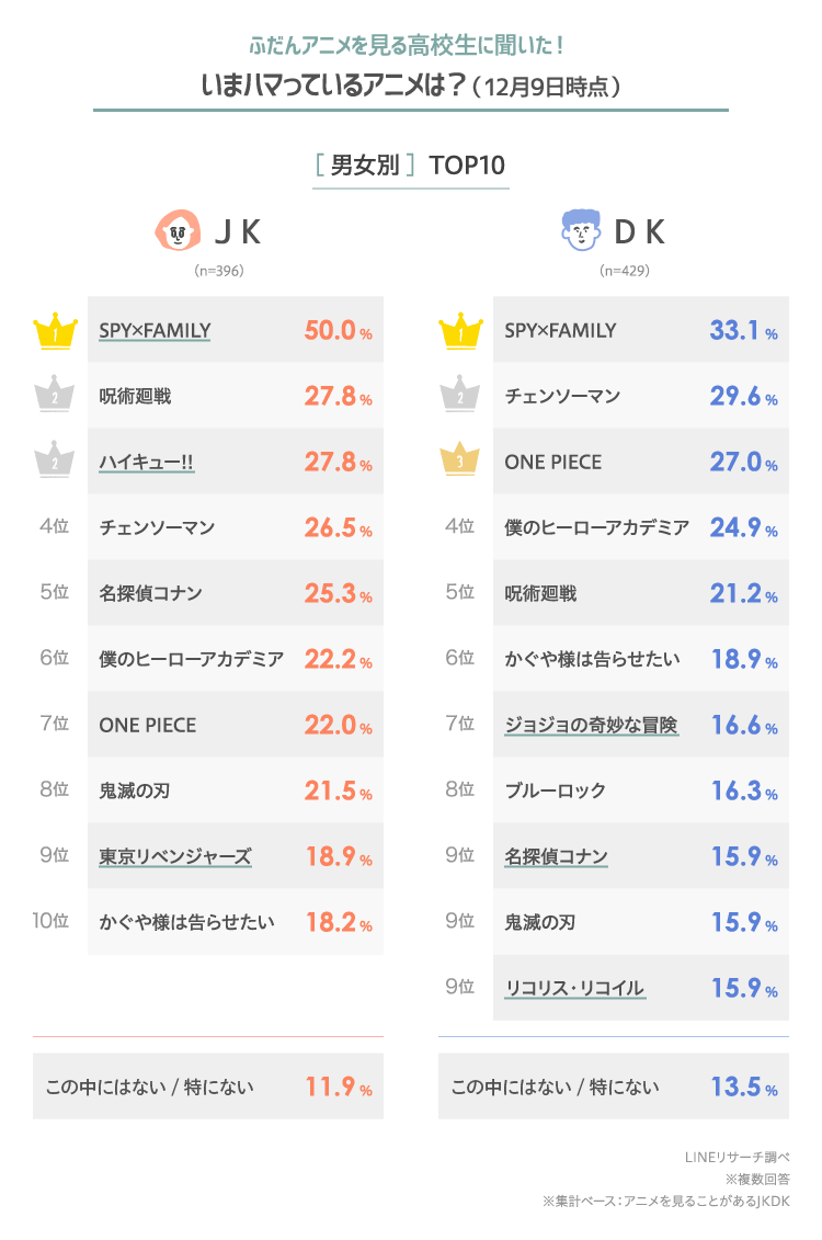 一方女子高生では、前回のランキングと同様に「呪術廻戦」「ハイキュー!!」が上位に入り、同率2位となりました。