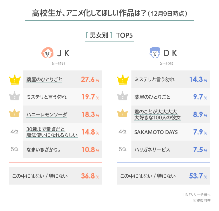 アニメ化してほしい作品の全体1位は「薬屋のひとりごと」で、2位は「ミステリと言う勿れ」でした。男女ともに上位となっていますが、女子高生では「薬屋のひとりごと」が3割弱の高い割合で1位となりました。
