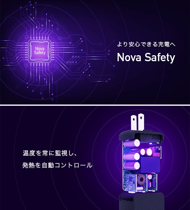 「Nova Safety」は『NovaPort TRIO 65W3C』に搭載された安全保護機能。温度を常に監視し、製品の発熱を自動調整します。温度管理を行うことでより安心して充電いただけることを目指しました。