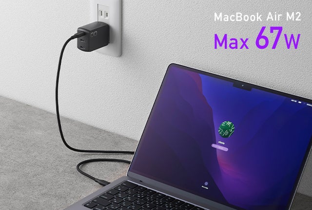 『NovaPort TRIO 65W3C』は世界最小サイズながら最大67Wの高出力を実現。イヤホンやスマートウォッチなどのスモールデバイスやスマートフォン、タブレットへの充電はもちろん、ノートPCやMacBook Air M2に最速充電が可能で、お手持ちのデバイスを選ぶことなく、幅広いデバイスへの充電が可能です。