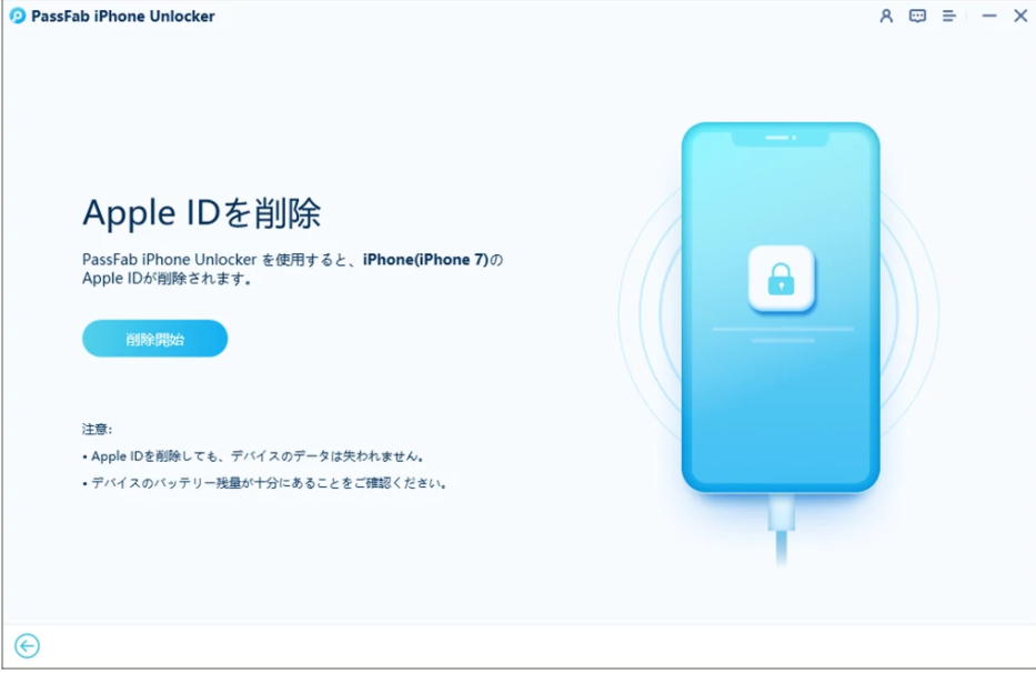 Step2:接続が完了すると、プログラムに「削除開始」ボタンが表示されます。クリックすると、iPhoneまたはiPadに関連付けられているApple IDまたはiCloudアカウントのロックが解除されます。