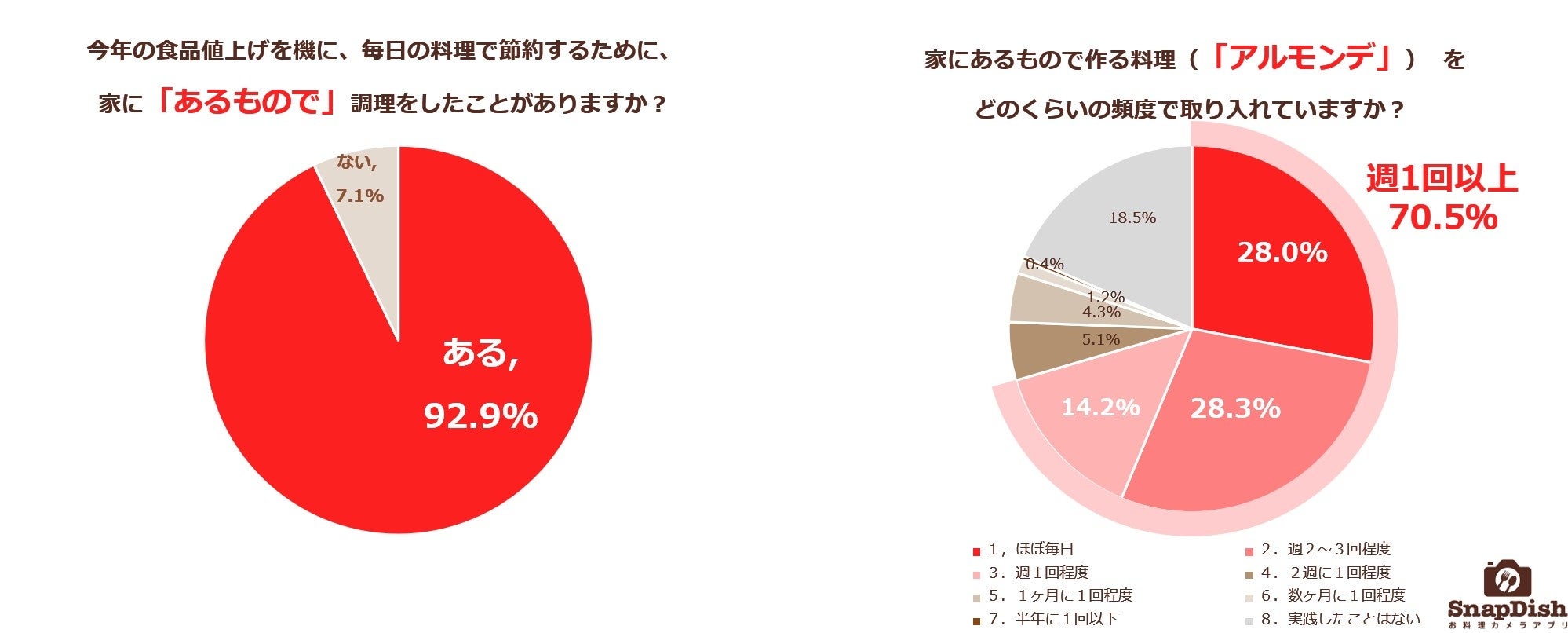 22年の食品値上げをきっかけに、節約のために家にあるもので調理をしたことがあるかという質問には、約93%が「ある」と回答。「アルモンデ」の頻度については「週1回以上」実践する人が約7割にも上り、約3割は「ほぼ毎日」と回答。これまでも日々のやりくりとして家庭で行われてきたことがスナップディッシュ発の「アルモンデ」という呼び名で顕在化し、物価上昇トレンドの中でポジティブに節約するコミュニケーションとして広く食卓に浸透してきていると見ています。
