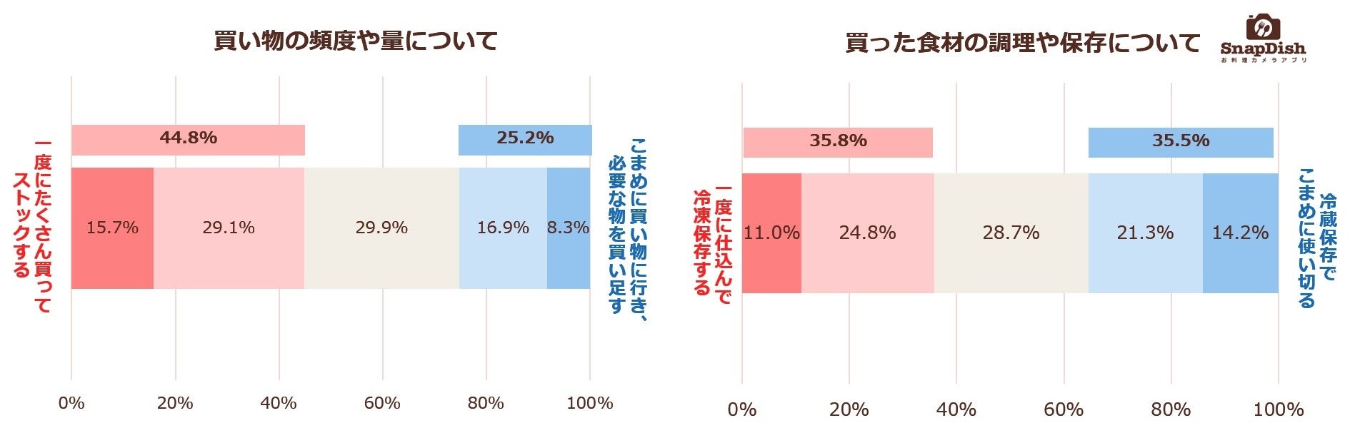 買い物や買った食品の保存方法については、「一度にたくさん買ってストックする」が約45%と、「こまめに買い足す」よりも約20pt高く多数派に。買った食材の保存については「冷蔵保存」派(約36%)と「冷凍保存」派(約36%)がほぼ同数となり、食品ストックを上手に活用するために、冷蔵に加えて冷凍も駆使していることがわかります。