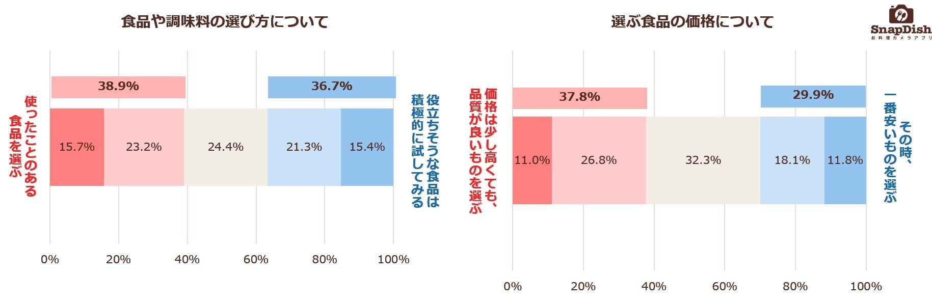 食品の選び方については、「使ったことがある食品を選ぶ」(約39%)と「役立ちそうな食品は積極的に試してみる」(約37%)が拮抗、価格については「少し高くても品質が良いものを選ぶ」派は「一番安いものを選ぶ」派より8pt高い約38%となり、価格変動によって選ぶ食品を価格だけでなく品質も吟味して見直し、役立ちそうな新しい食品へのトライアルにもつながっていると見ています。