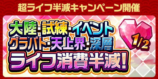 期間中、大陸・試練・イベント・グランバトル・天上界・深層で消費するライフが半減されます。