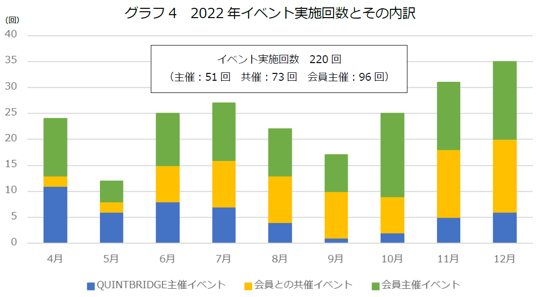利用者数増加の大きな要因の一つとして、ほぼ毎日複数回開催されているイベントが挙げられます。QUINTBRIDGEでは、施設主催のイベントに加え、会員と施設の共催イベント、会員主催イベントが開催されているのが特徴で、会員が主体的にQUINTBRIDGEに関わり、コミュニティ活動が自走してきたことが大きく影響しています。