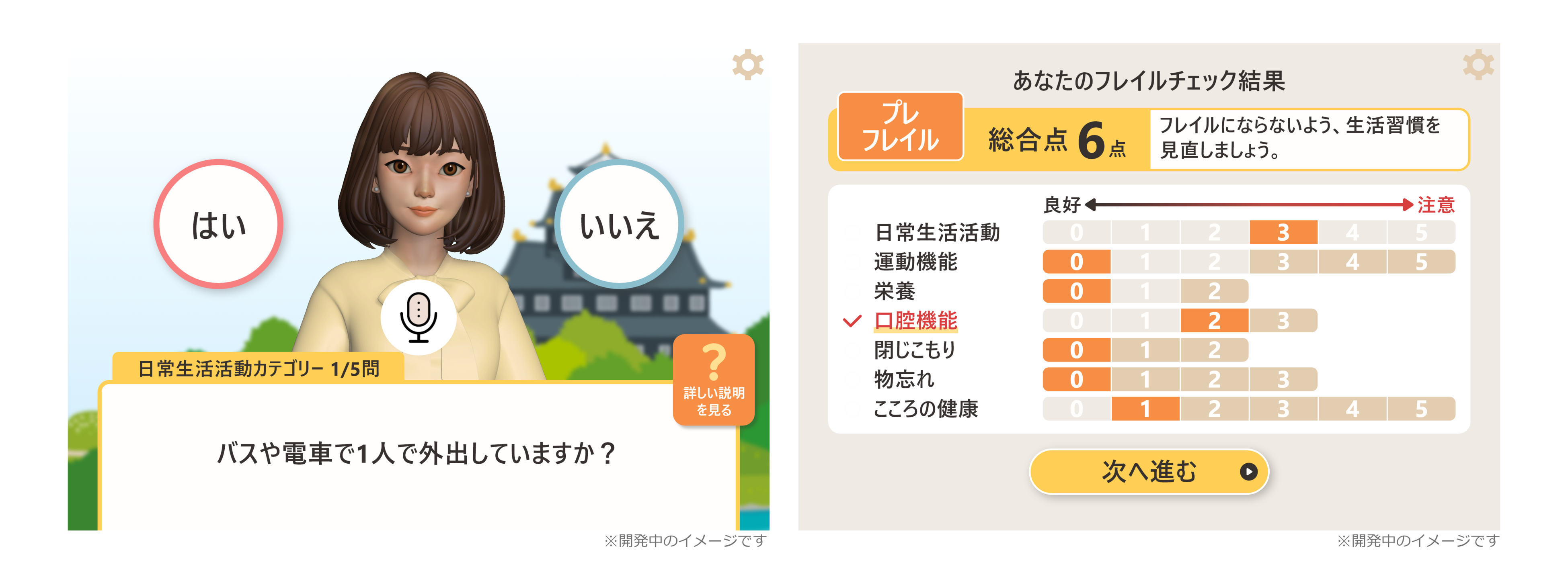 本取り組みでは、タブレット上のHYPER CUBE提供アプリ「トモニ」を通じてAIとの対話型フレイル健康チェックを行うことができます。「トモニ」は人の回答を認識し、高齢者にとってハードルの高いタブレット操作を行わずにフレイル健康チェックを行うことが可能で、今まで手作業だった計算や、記録などを自動化し、健康のためのアドバイスを中心に人が介在して、被験者のフォローを行います。