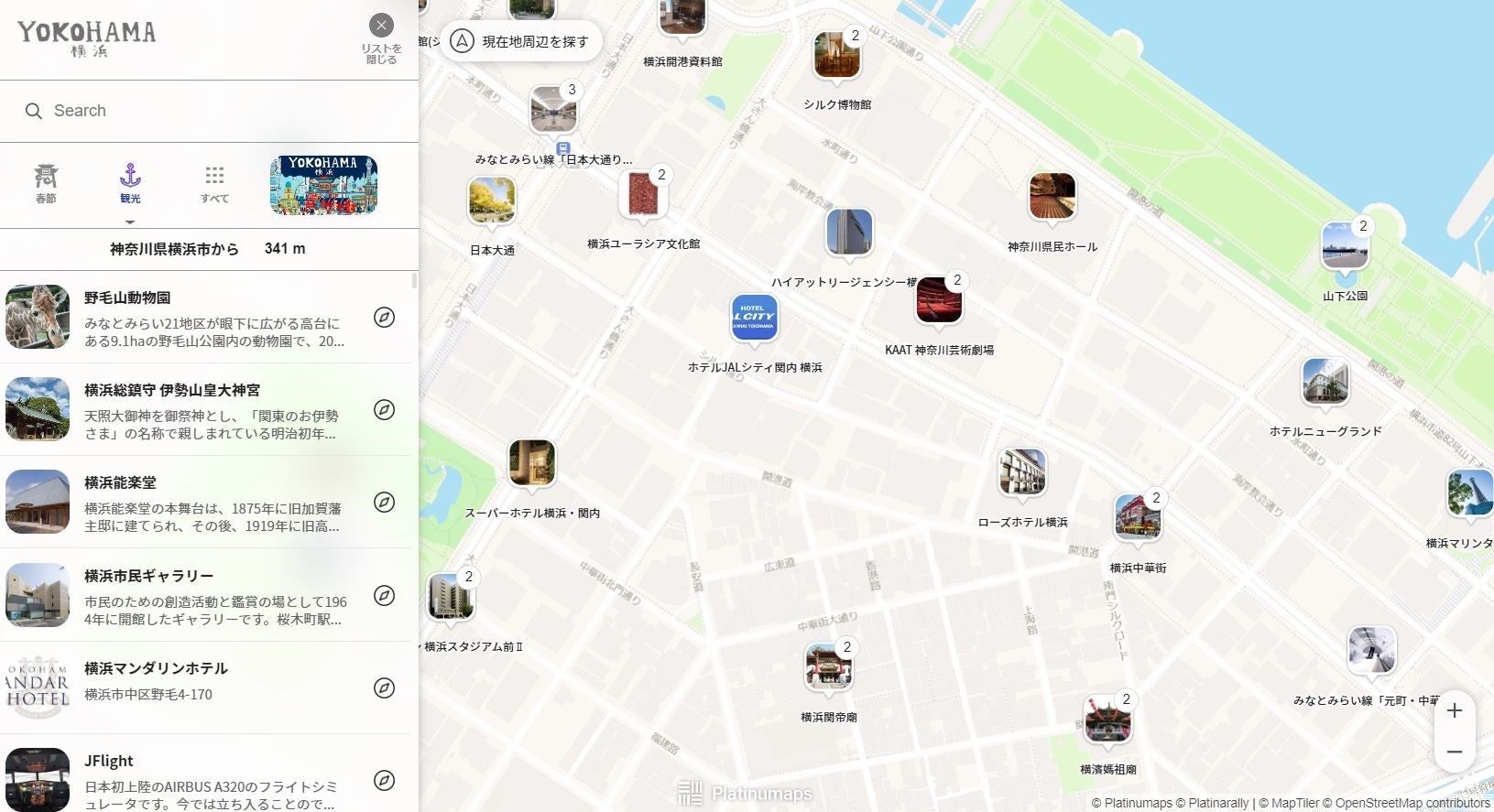 ・表示区分を変更することで、横浜エリアの観光スポットの場所や詳細情報、ルート案内も可能