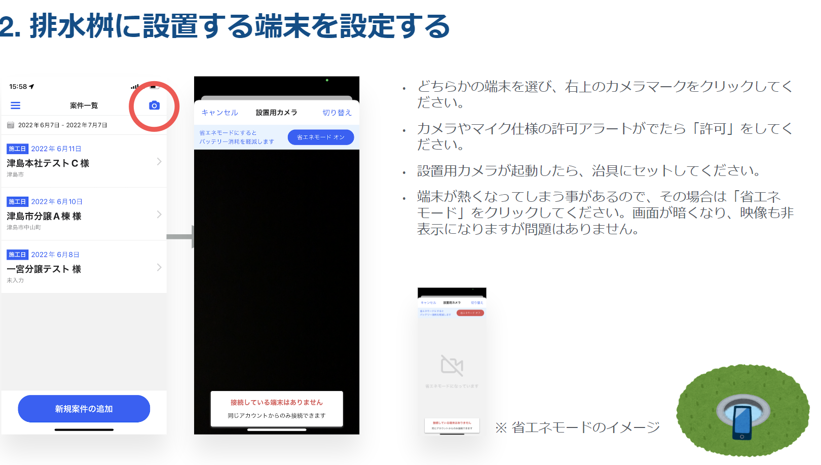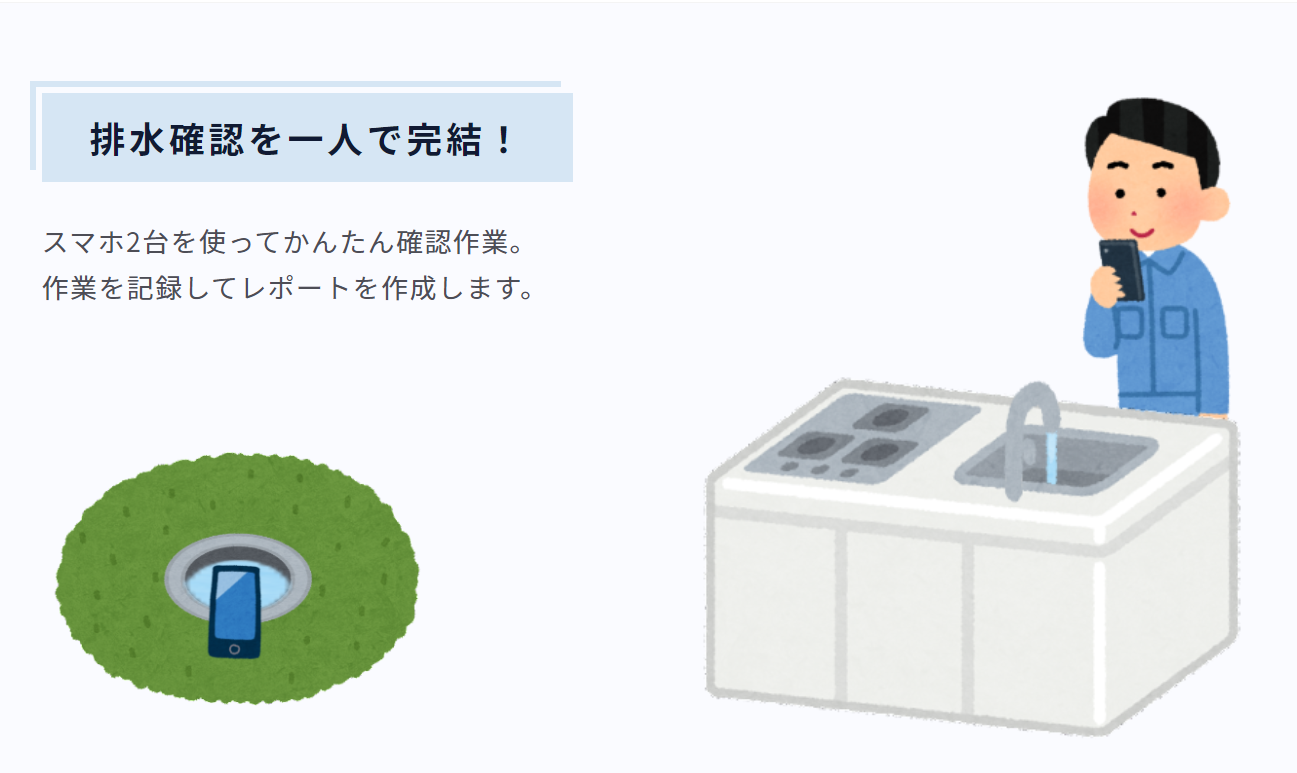 今まで2人で行っていた通水確認をスマホ2台を使って一人で行うことができます。