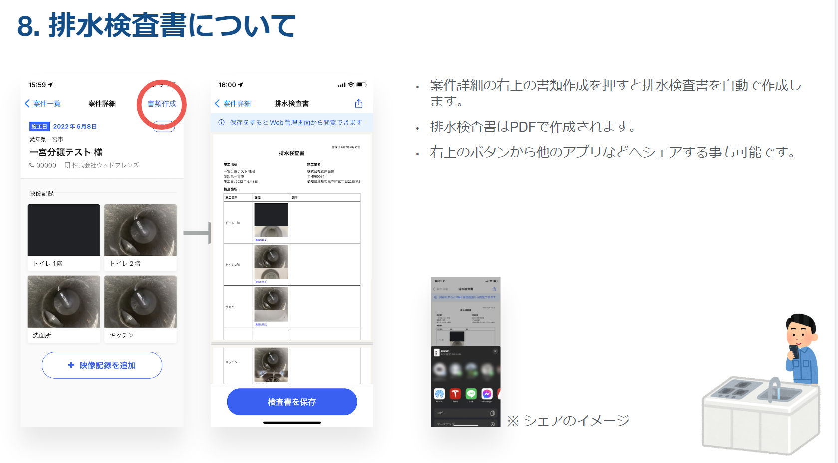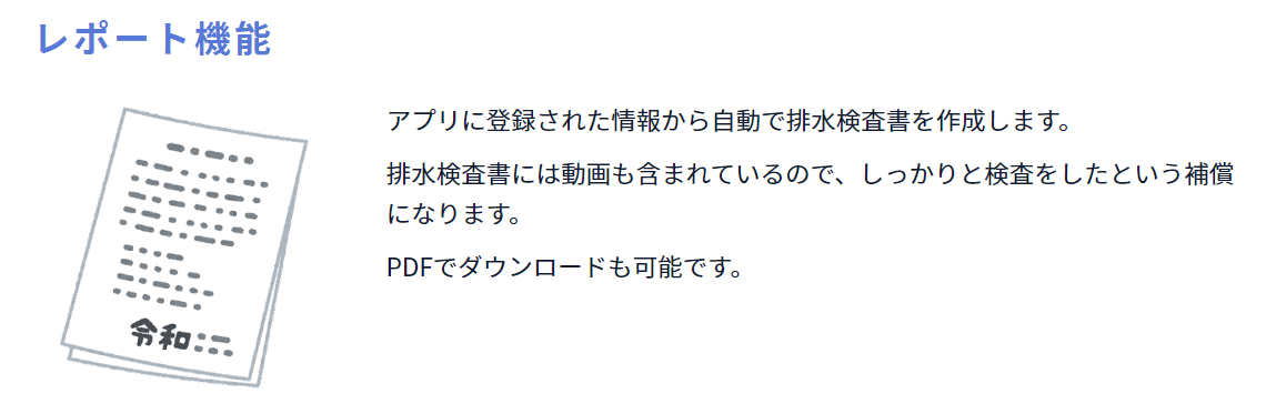 通水確認作業を撮影した動画を保存しておけば、1クリックで検査書を自動作成し、