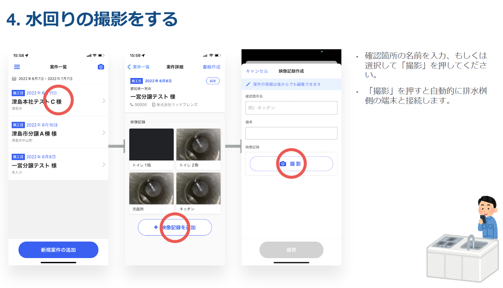 水回りの点検状況と排水が最終ますまで流れていることを確認できるとともに動画で