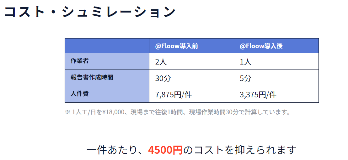 「@Floow」の活用によって、今まで2人で行っていた通水確認作業を1人で行い、さらに検査書の作成時間短縮により、作業コストを大幅に削減します。