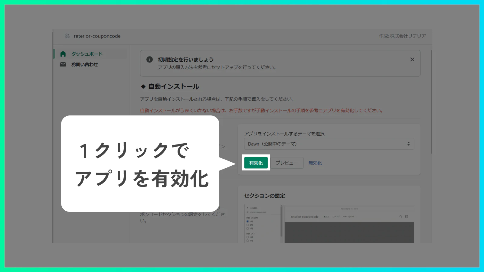 「クーポンコード 1クリック コピー|リテリア Coupon」は、1クリックでアプリを簡単に有効化することができます。アプリをインストールしてすぐに、クーポンセクションをShopifyストアに導入することができます。