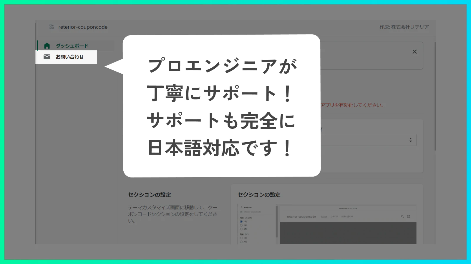 「クーポンコード 1クリック コピー|リテリア Coupon」は、日本製のShopifyアプリであるため、サポートも日本語です。日本のエンジニアがアプリの導入を丁寧にサポートします。