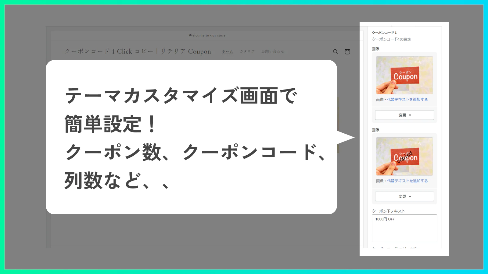 「クーポンコード 1クリック コピー|リテリア Coupon」は、高いカスタマイズ性の クーポンコードセクションをノーコードで簡単に導入することができます。表示する画像の数や、画像間の余白などを簡単に調整することができます。クーポンコードの表示/非表示なども、ノーコードで設定できます。