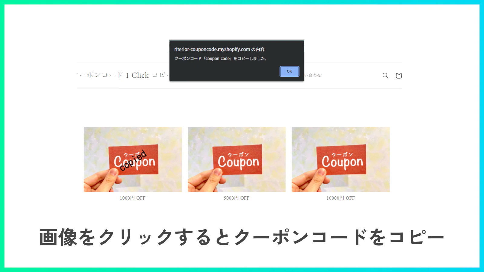「クーポンコード 1 クリック コピー|リテリア Coupon」は、1 クリックでクーポンコードをコピーできます。コピー成功時は、アラートが表示されコピーに成功したことをわかりやすく教えてくれます。