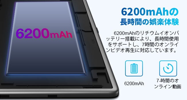低消費電力と低発熱を実現でき、様々な機能が強化されており、より軽快な動作と高速な処理が可能になります。大容量の長持ち6200mAhバッテリーで、動画、音楽、ゲームなど時間を気にせずたっぷりお楽めます。