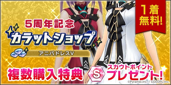 島田フミカネ氏デザインの5周年記念コスチューム「アニバドレスV」が販売中です。購入時におまけとして「アニバドレスVのカラーを変更可能なアイテム」が4色分入手できるほか、複数購入特典としてスカウトポイントもプレゼントしております。さらに今なら1着無料で入手できますので、ぜひご利用ください。