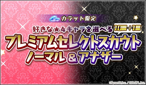 カラットを使用して1回限り、選んだ★4キャラを1人確定でスカウトできる「プレミアムセレクトスカウト」が開催中です。「ノーマル」と「アナザー」の2種類を順次開催いたしますので、この機会をお見逃しなく。