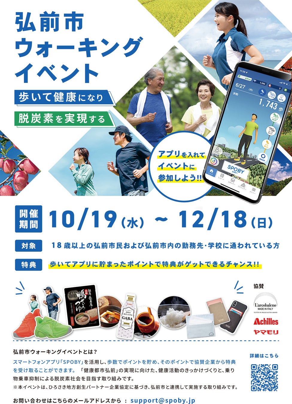 健康都市を目指す弘前市では、スマートフォンアプリ「SPOBY」を活用したウォーキングイベントを、弘前市民・弘前市内に通勤・通学する方約1,000人を対象に2ヶ月間開催し、一人あたり約1,350歩/日の歩数増加を実現しました。