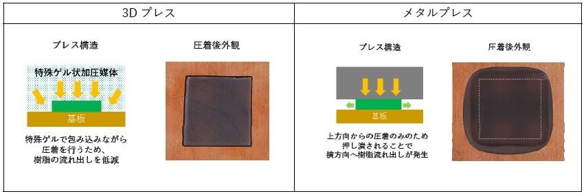 特殊ゲル状加圧媒体でワークを包み込んでから圧着を行うため、接着層の流れ出しを抑制します。