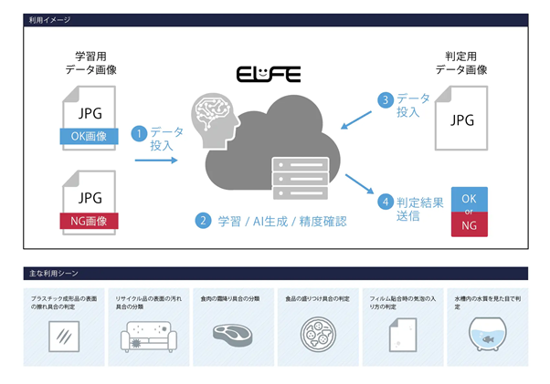 ELFEは判別モデルを自動開発する技術「Evolutional Learning for Feature Extraction」を採用した画像判別AIソリューションです。ソニー独自開発技術により、一般的な開発手法と比較して1/100程度の教師データでのAI開発を実現します。またデータをアップロードするだけでAIを自動生成できるため、AI初学者の方でもノーコードで開発が可能です。画像のほかセンサーデータや音データの利用、最適なアルゴリズムや利用環境の選択が可能で、外観検査や異常検知など業種を問わず様々な課題に対応します。