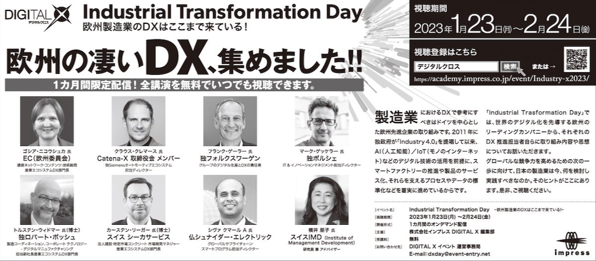 こうした欧州企業のDXへの取り組みを、その“思想”から理解し、自らのDXに転嫁することが日本の製造業の明日につながる−−。この考えのもと、当社の『DIGITAL X』編集部は、「Industrial Transformation Day」を企画し開催します。