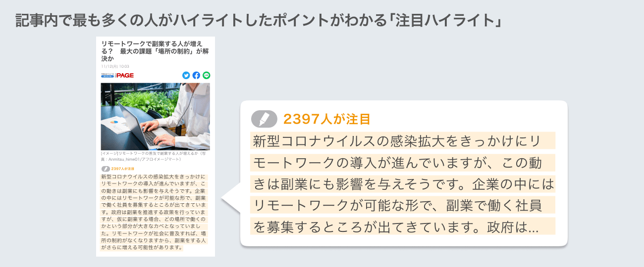 また、複数のユーザーが同じポイントにハイライトをすると、そこにハイライトをした人数が表示されます。記事内で最も多くのハイライトがついたポイントは「注目ハイライト」として表示され、一目で他のユーザーが注目したポイントをつかむことができるのも特徴です。