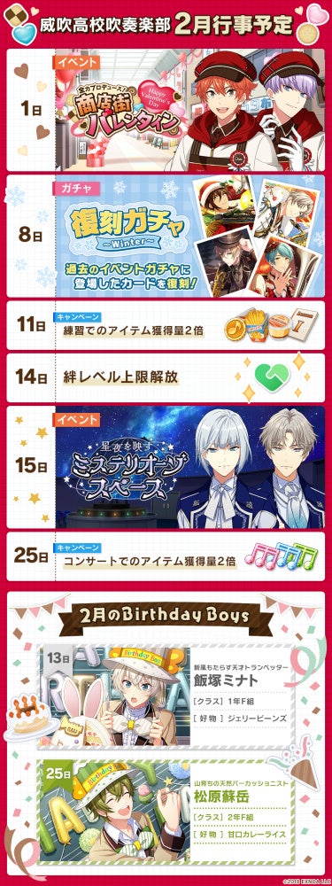 2月1日(水)より「全力プロデュース!商店街バレンタイン」、15日(水)より「星夜を映すミステリオーゾスペース」のイベントを開催します。また、2月14日(火)には絆レベルの上限解放を実施します。