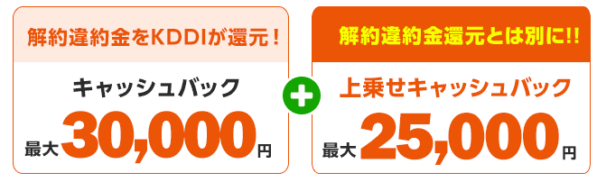 途中解約による違約金をKDDIが還元するものや追加キャッシュバックする特典があります!◎