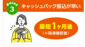 キャッシュバックが早い!!なんと≪最短1ヶ月後には、指定の口座へ現金をお振込»いたします♪