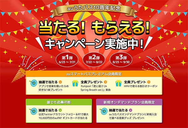 auうたパスでは、6月23日(木)から、「auうたパス10周年記念 当たる!もらえる!キャンペーン」第1弾を実施中。本キャンペペーンは第3弾まで続き、今後も続々とキャンペーンを発表します。内容はキャンペーンURLでご確認ください。