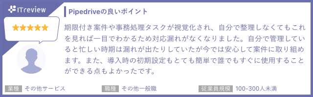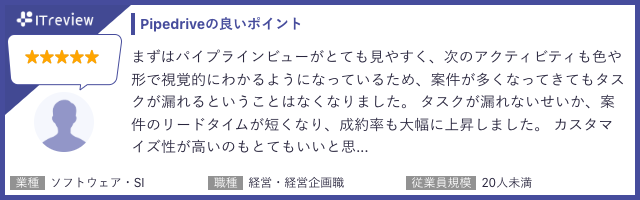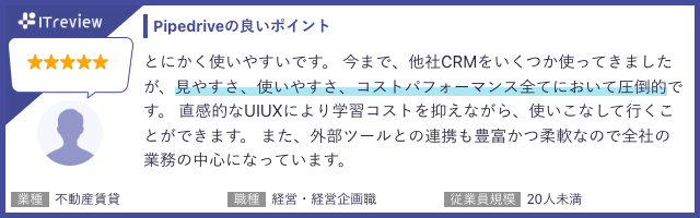 ITreviewにて、Pipedriveを実際に利用いただいているお客様よりたくさんのお声をいただいております。
