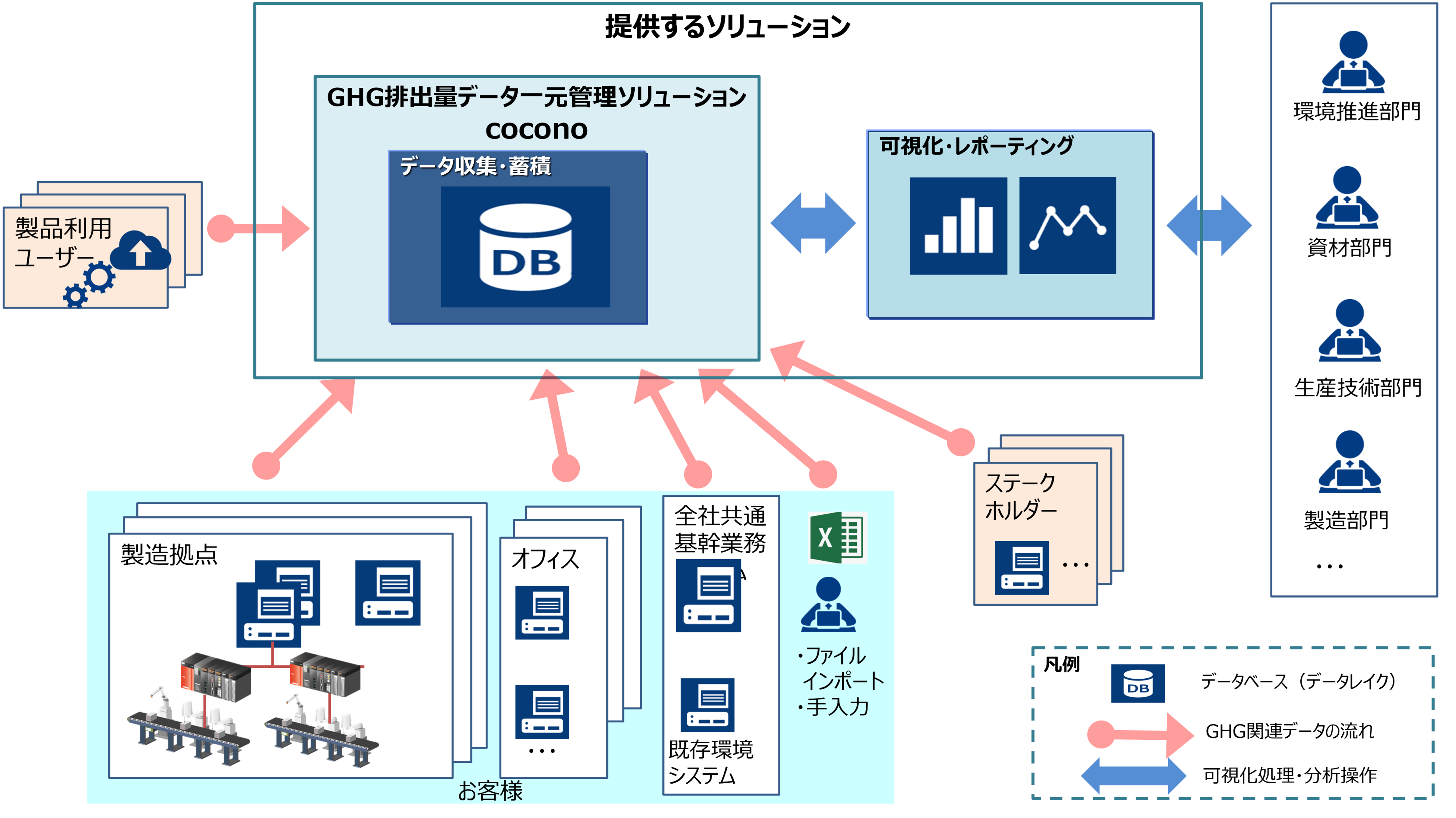 | GHG排出量データ一元管理ソリューション「cocono」 | 〇データ収集・蓄積機能 〇CFP算定機能 ○設計段階排出量シミュレーション機能 〇データ連携機能(オプション)・排出量算定・可視化サービス連携 |